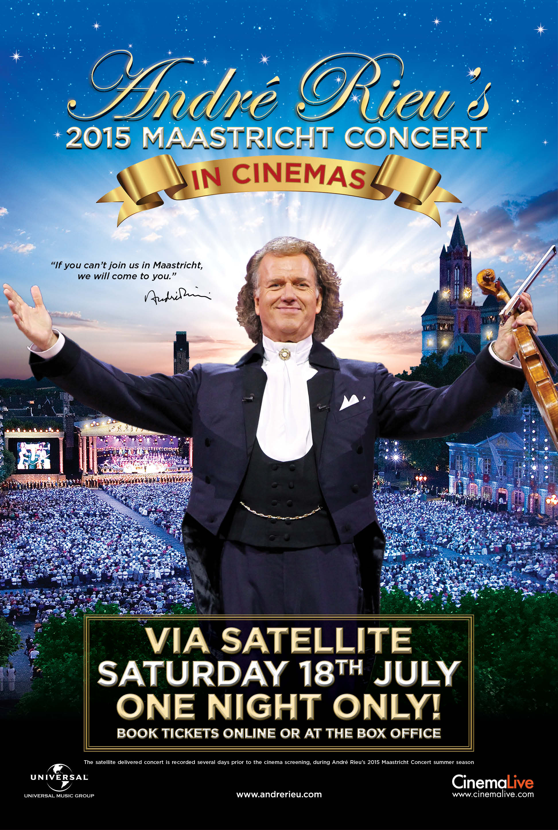 Valssin kuninkaana tunnettu André Rieu esiintyy vuosittain tuhansien faniensa edessä kauniin kotikaupunkinsa Maastrichtin keskiaikaisella kaupunginaukiolla. Kuten aina, hänen kanssaan esiintyy Johann Strauss -okesteri, vakiokalustoon kuuluvat sopraanot, tenorit sekä erityislaatuiset vierailevat tähdet. Maastrichtin konsertit ovat Andrén faneille vuoden kohokohta, ja näyttää siltä että vuodesta 2015 tulee kaikkein suurin ja ikimuistoisin koskaan elokuteattereihin välitetty konsertti.